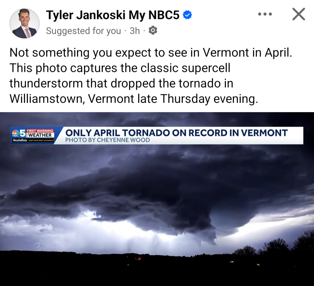 Possible tornado last night a couple of miles from me. NWS sent a team out to survey. https://www.wcax.com/2026/04/17/nws-surveying-thunderstorm-damage-williamstown-friday/ https://www.mynbc5.com/article/nws-tornado-investigation-williamstown-vermont/71051947