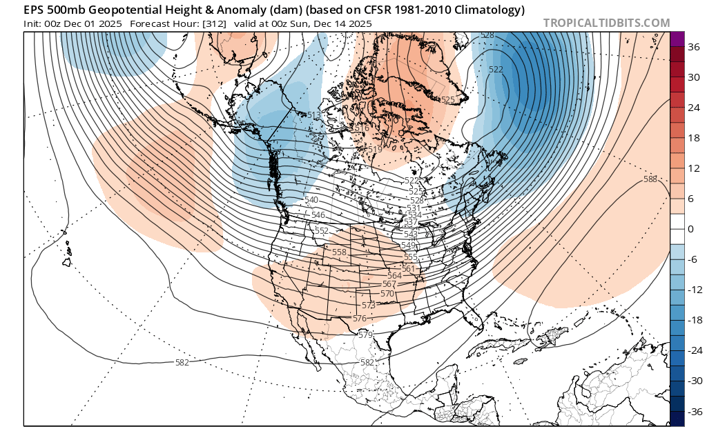 The EPS has been handling this pattern pretty well over the last week or so. It has been fairly steady with the MJO 6 500 mb pattern dominating. Longer duration MJO 6 patterns tend to show a poleward shift with more ridging returning to Plains and East after the first 10 days. This matches the moderation the EPS has been showing in the pattern for mid month. So the first 10 days or so will probably be the coldest part of December relative to the means.