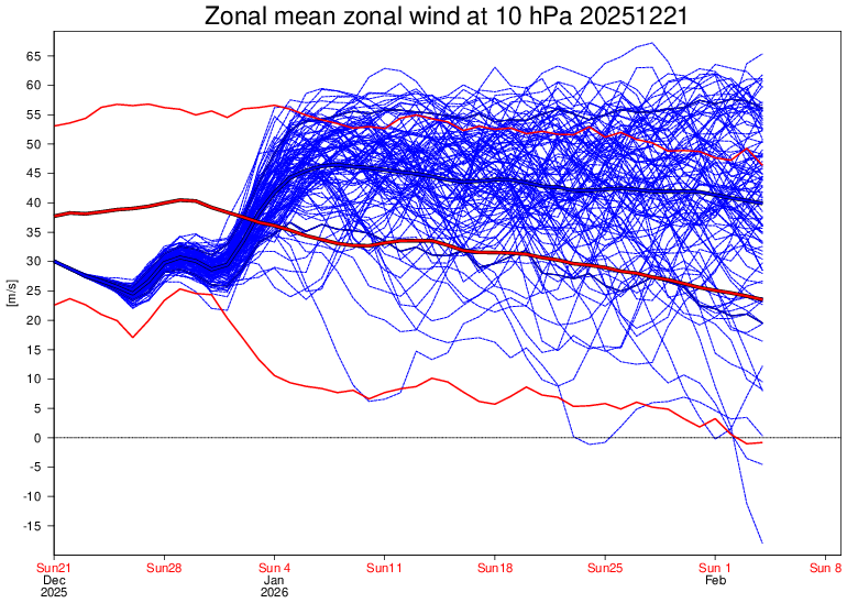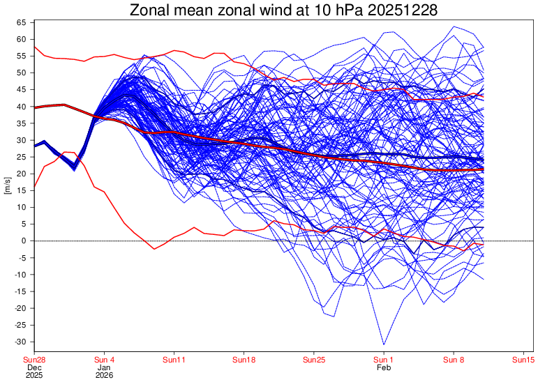 Check out how much weaker the SPV forecast is at 10 mb based on the 60N mean zonal wind on the Euro Weeklies! One week ago (12/21 run): quite strong just about all Jan through Feb 4th with no end in sight (mean 40-47 m/s): Today (12/28 run): near normal Jan 10th-Feb 11th (mean only 25-35):