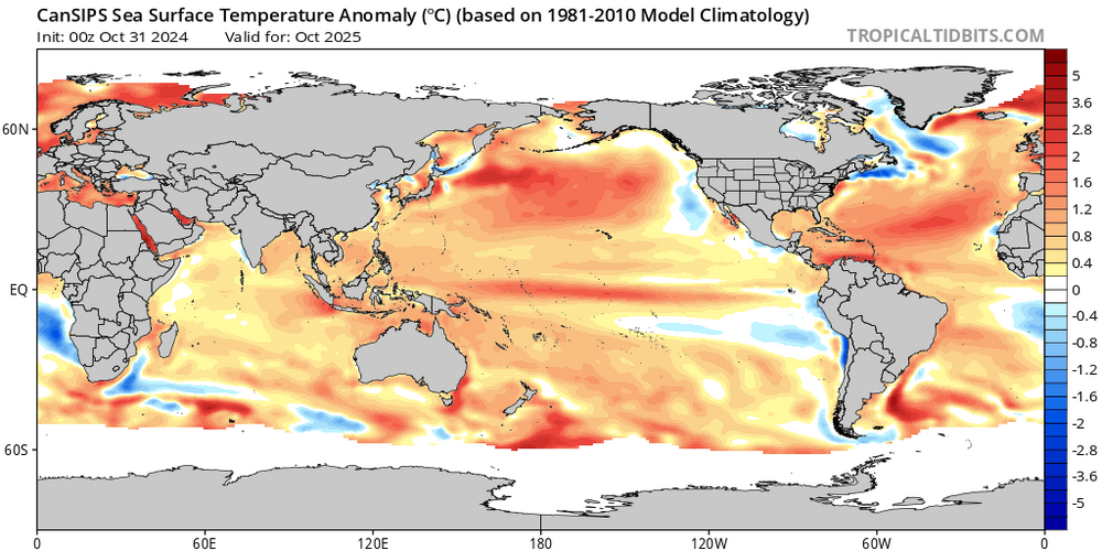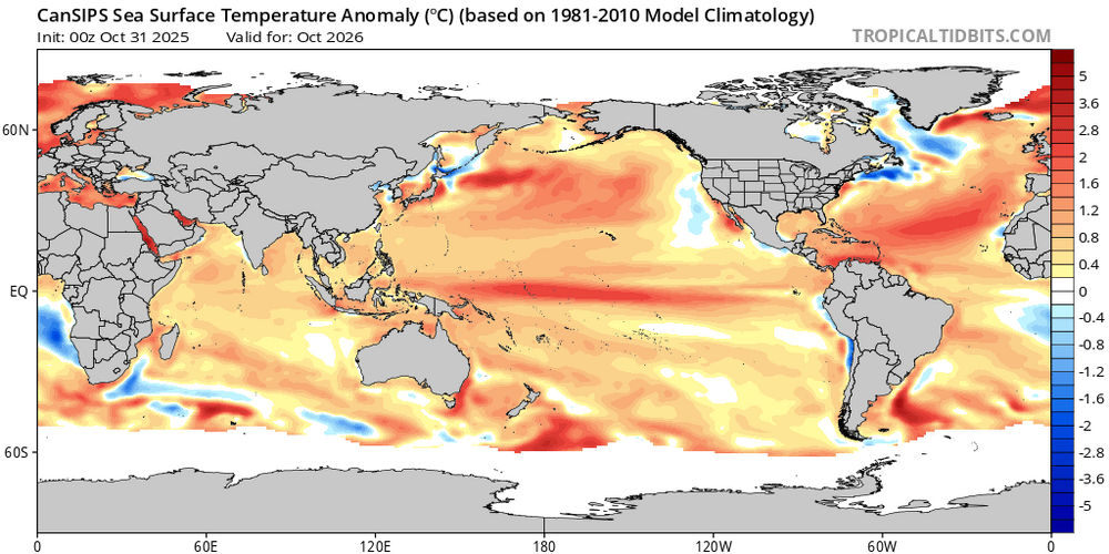 Hey Mitch, I’d love to see it! But a huge grain of salt is advised. One year ago the CANSIPS was forecasting a Modoki Nino for now, about which I posted last year and got excited. Obviously, that failed miserably and I’ve learned from it. One year ago, CANSIPS forecast this for Oct of 2025: Compare that to the new CANSIPS for Oct of 2026: the entire globe looks so similar that it almost looks like a copy and paste although it’s slightly warmer in Nino regions. Hopefully this new CANSIPS for next Oct won’t also verify way off! @Carvers Gap@donsutherland1