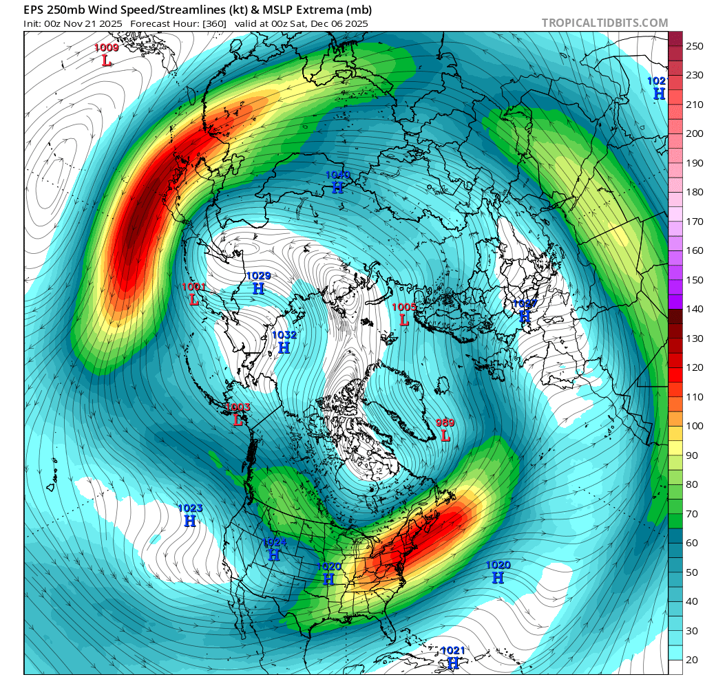 Winter rarely just blasts into the MA early season. It's a carving process and we're usually 3rd on the list when it happens (MW first, NE second, etc). First week of Dec looks like a carving process to me. This is an interesting jet panel. If you animate d10-15 it's pretty clear that the eps wants to press (or carve) the northern jet down into our latitudes. Still not good enough here but the process is ongoing Overall it's an encouraging jet structure with split flow and convergence. Mean QPF panels show moist SW flow embedded in this. If this verifies, areas to our west and NE will be in the crosshairs for overrunning type snowfall. If the carve continues southward it would be our first real window of opportunity beyond d15. Patterns like this can be active with precip but not really a big storm pattern. Which is probably good. It's really really hard early season to get a wound up storm to track underneath of us or be cold enough for snow. Much higher odds with a weaker shortwave zipping along
