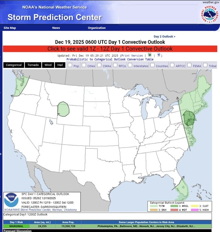 SPC AC 190529 Day 1 Convective Outlook NWS Storm Prediction Center Norman OK 1129 PM CST Thu Dec 18 2025 Valid 191200Z - 201200Z ...THERE IS A MARGINAL RISK OF SEVERE THUNDERSTORMS ACROSS PORTIONS OF THE MID ATLANTIC... ...SUMMARY... Isolated damaging winds may accompany convection over the Mid Atlantic today. ...Mid Atlantic... Late-evening water-vapor imagery depicts a notable midlevel trough over the MS Valley, shifting east in line with latest model guidance. This feature is forecast to take a more negative-tilt orientation by late morning as 100+kt 500mb speed max develops/translates across the Mid Atlantic by 18z. Impressive 12hr height falls at 500mb will overspread the OH Valley into New England where values will range from 240-300m in response to this strong feature. Needless to say, very strong wind fields will provide background support for organized frontal convection. HREF guidance is in general agreement that a narrow strongly forced line of convection will develop along the surging cold front early in the period. Forecast soundings do not exhibit more than weak SBCAPE with this frontal convection, but some mixing is expected given that 0-3km lapse rates should be on the order of 7 C/km. 40kt mean wind within this layer is expected to contribute to gusty winds with this activity. Have introduced MRGL Risk of damaging winds to account for strong gusts with a narrow line of convection that will surge east along the front. Given the limited buoyancy across southern New England will not introduce wind probabilities at this time. ..Darrow/Squitieri.. 12/19/2025 CLICK TO GET WUUS01 PTSDY1 PRODUCT NOTE: THE NEXT DAY 1 OUTLOOK IS SCHEDULED BY 1300Z CURRENT UTC TIME: 0944Z (4:44AM), RELOAD THIS PAGE TO UPDATE THE TIME - Today