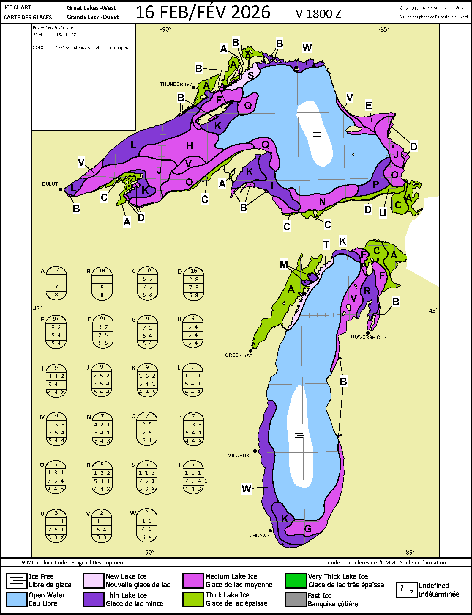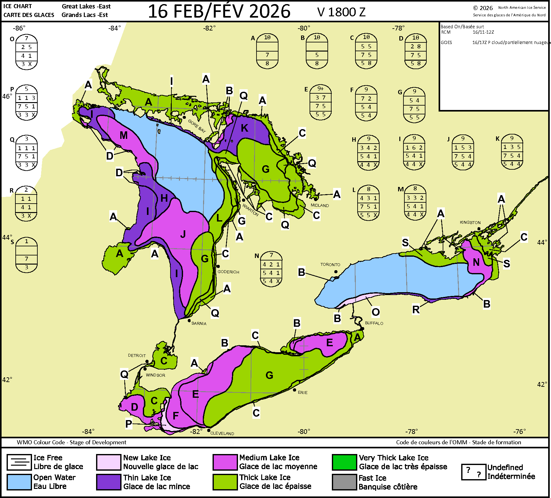 What is hard to see, is the clear, thin ice nearer the W shore. All that ice will break up, and pile. The ice you see is older, med thick ice that will plow into the W areas. Here's todays ice maps using the thickness colors, with egg codes.