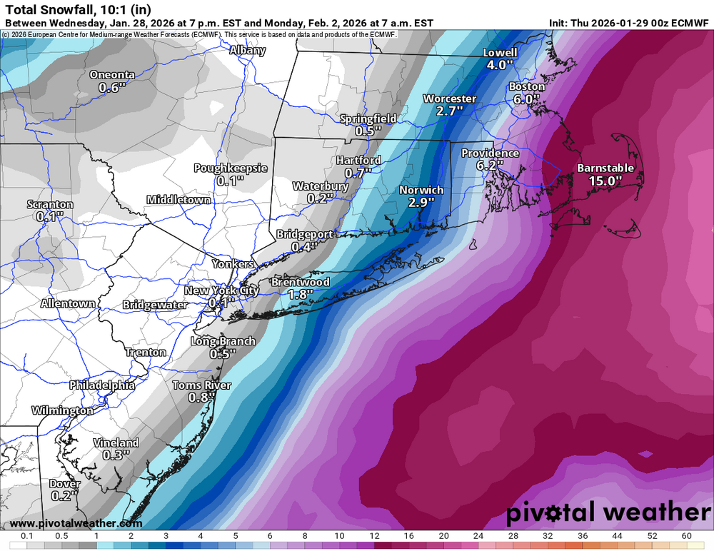 An atypical thing about this storm, it deeply occludes rather far S for a coastal storm (~35N) and has multiple low centers strung out SW to NE, so you will have a huge swath of heavy precip NW of the center, pivoting slowly. How much this pivot is obviously is key (pivotal!?). It can be one of those things, once you are in it, you are in it for awhile, yet not to far NW, just internment flakes in a dry stiff wind. So very sharp snowfall gradients as possible. Among the best snowfall gradient storm for eastern MA occurred 2/9/1987. I got 2" in Woburn MA w/ no real wind, and CHH had 23.4" w/ frequent gusts 60-70 kt. Second Cape Cod-only blizzard in two weeks! A 7-year old CoastalWx was NOT happy! But I was not either, even though 1986-87 was a good winter (only one from 1984-85 to 1991-92), it could have been *much* better! -