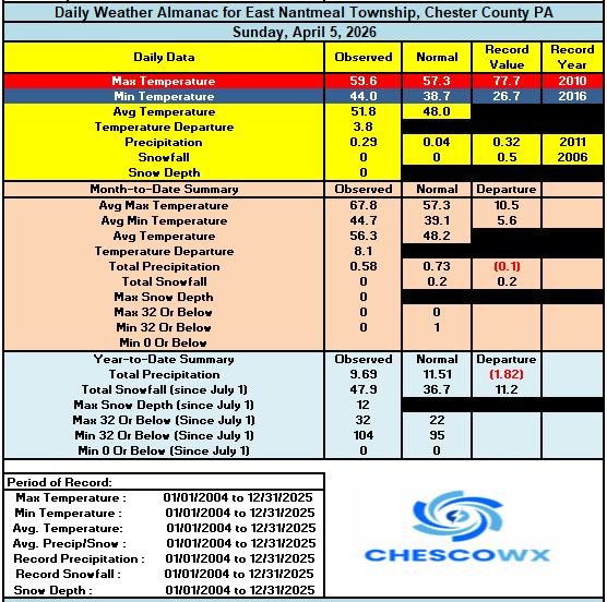 4. Some unseasonably cold temperatures through mid-week including a hard freeze tomorrow night into Wednesday morning. Temperatures will remain in the upper 40's which is a solid 10 degrees below normal for the date. We slowly modify to slightly above normal temperatures with highs in the mid to upper 60's by the weekend. Looking ahead to next week we should see a big warmup well into the 70's before another cool down back to below normal temperatures by late next week. Overall, a dry pattern throughout the period. Albedoman will not be pleased!