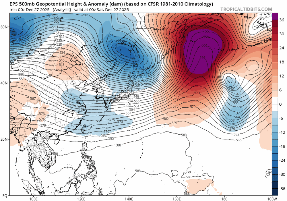 Decent look after the next couple days,you should be looking at a pattern change the next couple days.As this trough passes through Russia/Mongolia,models continue to show rising heights in this region for several days,just get ready for some moderation into the first week of Jan,throughs into Mongolia/Russia mean ridge building into the Koreas,so you should/could be seeing a -PNA for a brief time