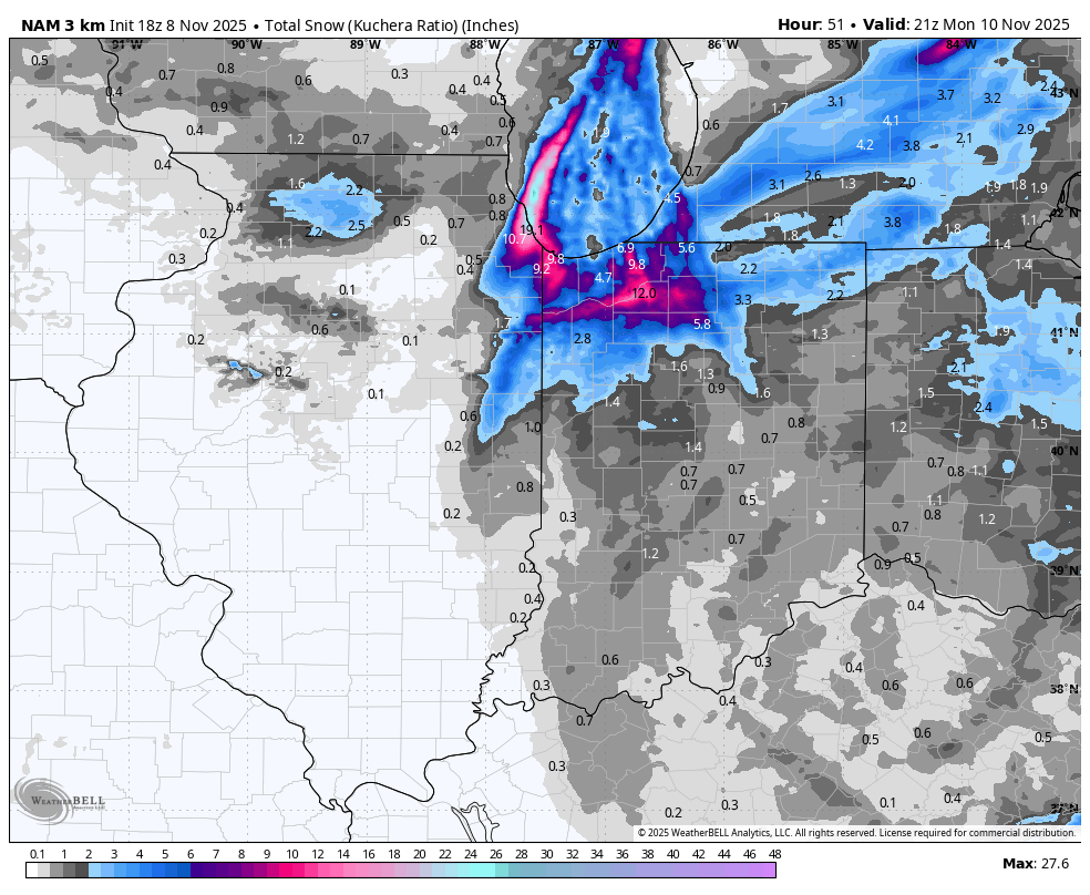 Updated "expected" snow maps upped a lot in Illinois to 7" expected in Chicago now. Probably cuz ^ and 18z hrrr. -
