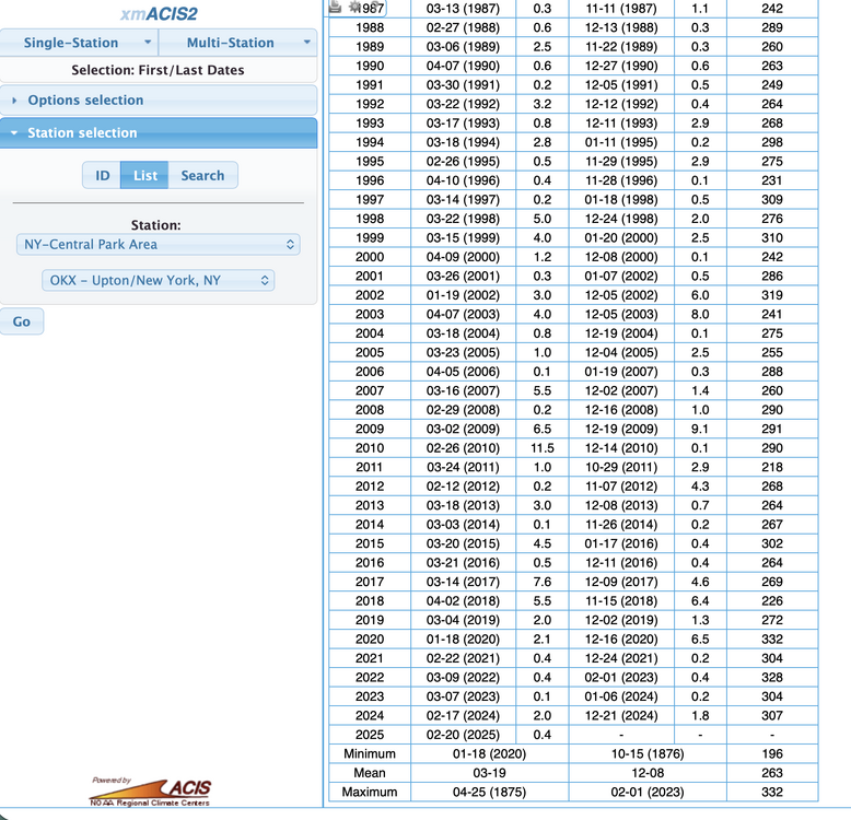 This was the 6th coldest December 5th low in NYC and 7th coldest max. Data for December 5 - NY CITY CENTRAL PARK, NY Click column heading to sort ascending, click again to sort descending. 1926-12-05 24 11 1.03 7.9 8 1886-12-05 22 13 0.37 5.3 M 1871-12-05 29 14 0.00 0.0 M 1935-12-05 37 15 0.00 0.0 0 1911-12-05 38 19 0.00 0.0 M 1901-12-05 27 19 0.00 0.0 M 2025-12-05 32 20 0.00 0.0 Data for December 5 - NY CITY CENTRAL PARK, NY Click column heading to sort ascending, click again to sort descending. 1886-12-05 22 13 0.37 5.3 M 1926-12-05 24 11 1.03 7.9 8 1901-12-05 27 19 0.00 0.0 M 1893-12-05 28 20 0.16 1.5 M 1871-12-05 29 14 0.00 0.0 M 1895-12-05 30 25 0.00 T M 2002-12-05 31 26 0.35 6.0 M 2025-12-05 32 20 0.00 0.0 0 1989-12-05 32 23 T T 0