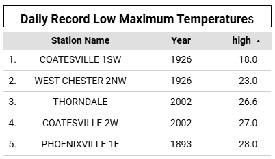 Quite a few stations across Chester County have remained in the 25 to 27 degree range for maximum temperatures so far today. If temperatures don't rise much more before midnight today will finish in the Top 3 coldest December 5th daytime highs since records began in 1893. So far here in East Nantmeal our high has been 25.7 degrees we are currently at 25.4 degrees. Below are the top 5 lowest max temperature days. -