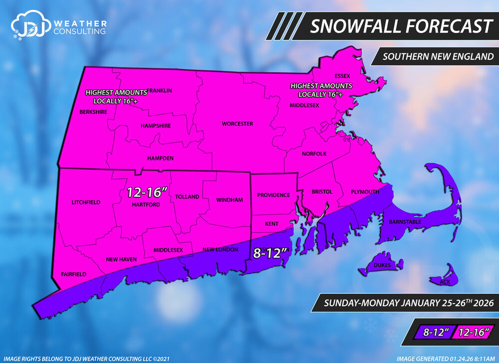2nd update and likely final call. We are still about 24hrs out so will do an update before the storm if anything major changes. We split the initial 8-16" range up to 8-12/12-16. Less on the s. coast and most in NE MA and Berkshires. Some thought on the forecast BUFKIT ratios initially start high and drop off closer to 10:1 as the warm air intrudes, this is less of an issue well inland where ratios will be a bit higher. Went with about 12-14:1 Strong H7 frontogensis tomorrow afternoon/eve will yield a period of 1-3" per hour and move E/NE Models still diverge on how far N the mix line gets but most of the damage will be done (floor of 8"), but went with slightly lower totals and bottom end of the 8-16 range there Definite signals for enhanced snowfall in E/NE MA but didn't feel confident enough to introduce a new range of 16-22, but highest totals likely there...i put that in text Most of snow appears to fall Sunday/Sun Night with any redeveloping snows wrapping around N of the MA boarder and will add to totals there by an inch or two We are probably one of the most conservative fx out there right now, def more so than the NWS. We'll see how today goes and update if needed, still should be a great storm for most w/ widespread 1 foot+. Biggest concern is southern areas. -