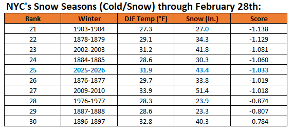 MET Winter 2025-26 at Detroit DJF avg temp: 25.2F (-3.2F) 43rd coldest out of 153 years Coldest since 2014-15 Coldest temp: -10F on Jan 24 # of days with a low below 0F: 5 (most since 2018-19) # of days with a low 9F or colder: 21 (most since 2014-15) # of days with a low 32F or colder: 83 (most since 2013-14) # of days with a HIGH 32F or colder: 45 (most since 2014-15) DJF precip: 3.92” (-2.64”) 17th driest out of 153 years Driest since 2020-21 DJF snowfall: 32.9” (-2.5”) 51st snowiest out of 153 years Snowiest since 2020-21 Largest snowstorm: 6.1” – Jan 14/15 Season snowfall thru 2/28- 38.8” (+1.5”) Days with 1”+ snowcover: 61 (most since 2013-14) Days with 6”+ snowcover: 21 (most since 2014-15) Peak snow depth: 9” (Jan 26, Jan 27, Jan 28, Jan 29, Feb 7) 19th most days with 1”+ snowcover out of 121 years Insane stat- In a winter full of deep cold and white ground, we managed to touch 60F+ 3 times this cold winter. Each time was a very brief but rapid spike. While not close to the record of 7, these 3 days were spaced out one in each month DJF. This is only the 2nd time on record this occurred. The other time was a very warm winter (1889-90). Lets compare- In an era when everyone wants to compare things to CC, the irony is that this winter most closely resembled a handful of winters from the 1900s-1910s. The cold temperatures, frequent snowfall, and solid blanket of snow that covered the ground most of the time but without any huge storms, and with NO big precip makers, is a throwback to the colder, drier climate of that era. Two in a Row- This is the 2nd colder than normal winter in a row. Last winter finished 0.9F below avg and this one 3.2F below avg. Last winter saw average snowcover despite below avg snowfall, so this is also 2 years in a row where snow covered the ground in a greater capacity than would be expected with the amount of snow that fell. If I had to guess- Ill say next winter locally will be milder with less snowcover but a bigger snowstorm than each of these past 2 winters. -