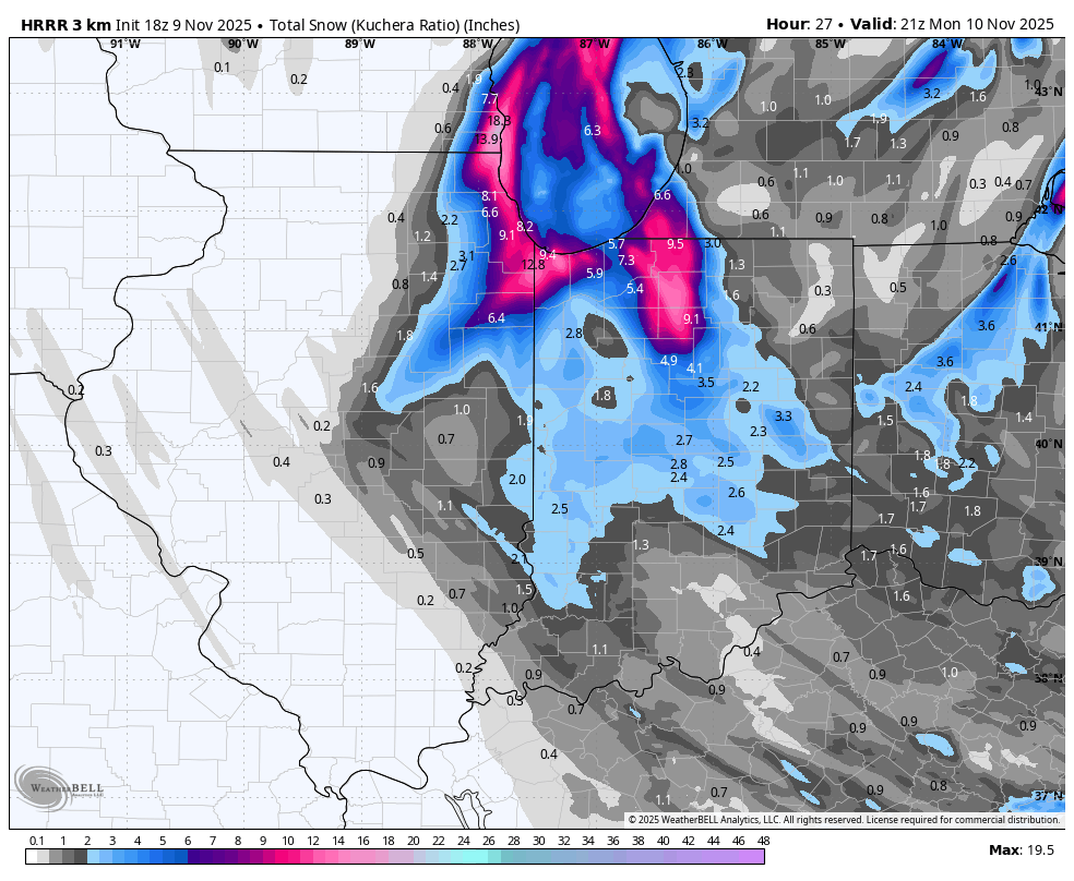 HRRR is liking Lake Co., IL & Kenosha a little more with the 18z. -