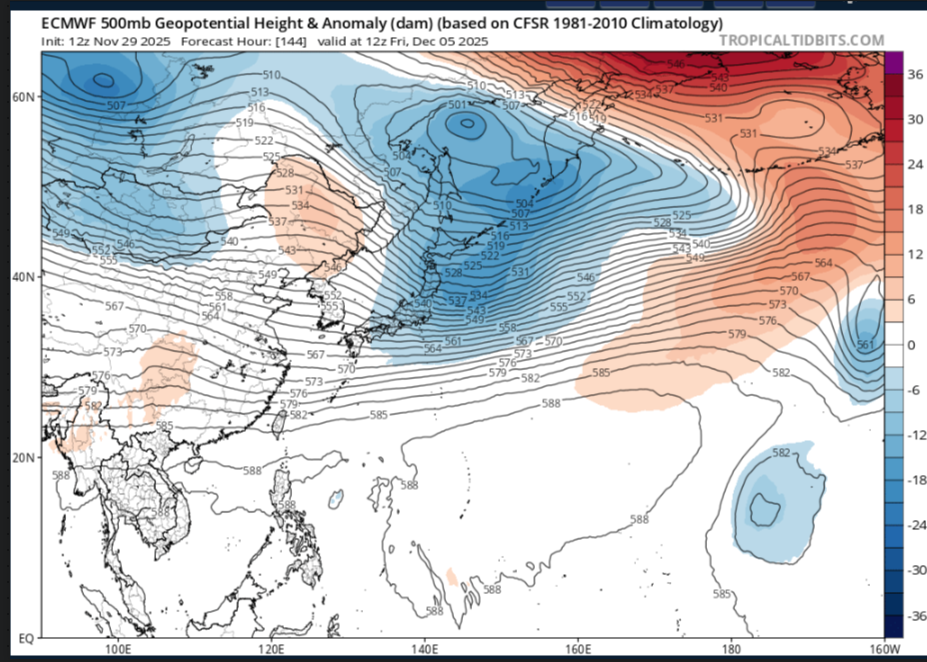 Its just my opinion but when the SOI dropped pretty good around the 23rd then rose before Thanksgiving and the dropped again after,this pattern could should more than likely look like this into East Asis into the first week of Dec,it wouldnt effect our weather until right before the mid month of Dec 29 Nov 2025 1011.21 1008.95 -3.95 14.40 8.89 28 Nov 2025 1011.09 1008.70 -3.12 14.81 8.88 27 Nov 2025 1011.74 1008.55 1.97 15.52 9.00 26 Nov 2025 1012.11 1006.05 20.23 16.24 9.20 25 Nov 2025 1009.58 1005.50 7.63 16.34 9.25 24 Nov 2025 1007.56 1004.90 -1.40 17.10 9.38 23 Nov 2025 1009.73 1000.85 38.17 17.97 9.60 22 Nov 2025 1011.59 1003.75 31.56 17.51 9.41 -