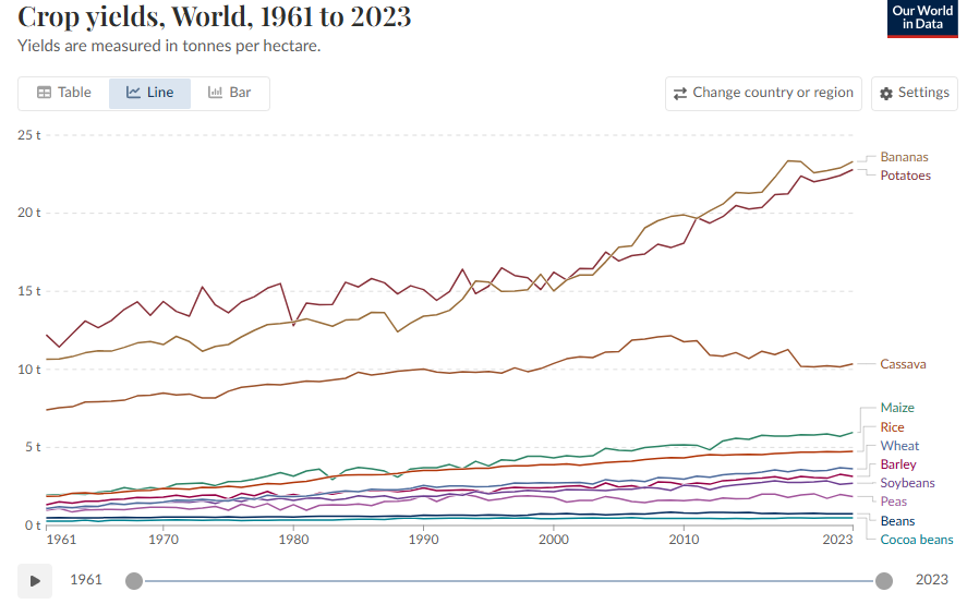 Boy you hit about all the MMGW scapegoat talking points there, didn't you? You forgot about rape though. (Yes, it's a thing) I'll just hit one of the scaries for now - crop failures - the rest can be inferred. The sky-is-falling narrative tends to fall apart when you look at the actual data, and not individual anecdotes. (ironically - much like looking at a weather event and claiming that it's an indicator of climate trends)