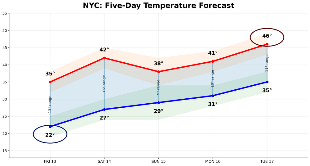 The 5-day NBM temperature forecast for NYC is below. Next week will likely see the mildest weather so far this month move into the NYC area. -