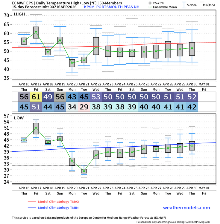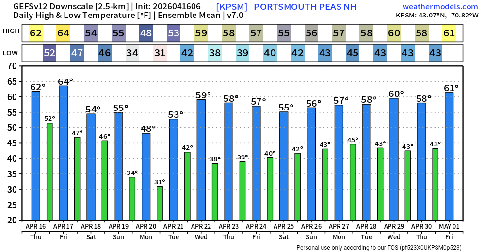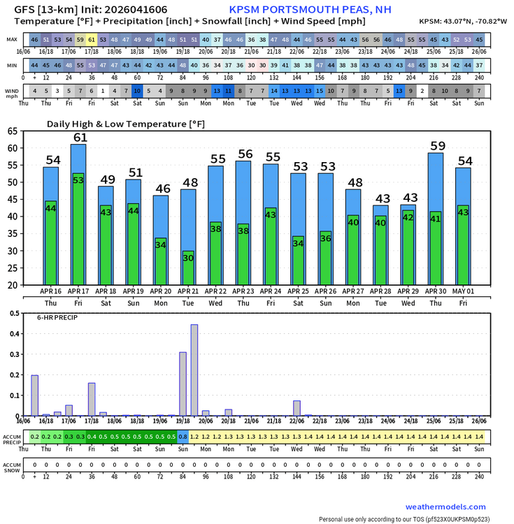 81 / 58 some clouds peak heat continues today. Fall back Friday and the weekend. Front through Sunday then a period of near to below normal overall with trough nearby the NE onshore flow backing middle of next week. Overall the peiord 4/20 - 4/28 looking cooler and we'll see how much of the rain / showers can add up to.