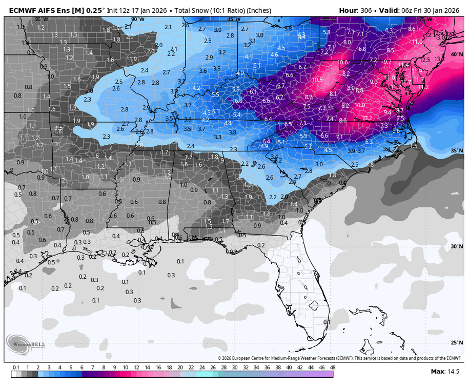 Euro AI is honking the horn. Every ens had at least a trace of snow somewhere in SC. 50/50. Wow. Trying not to get too excited. -