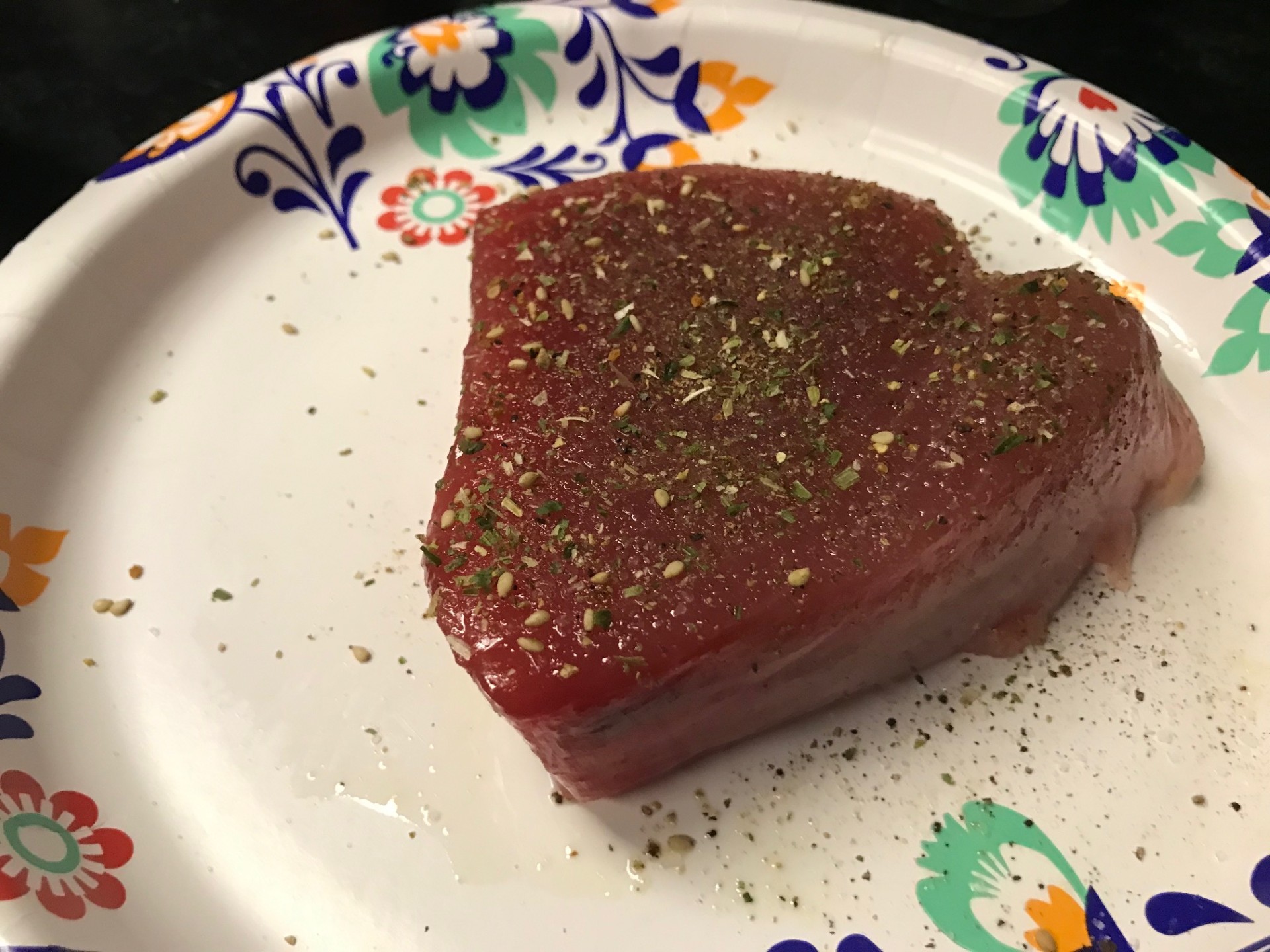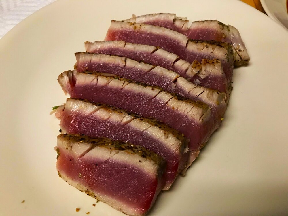 Fresh Bluefin Tuna. Paid 14 bucks. Imagine what this would have cost in a restaurant. Seasoned with salt, pepper, and Japanese Seven spice. Fuck yeah.