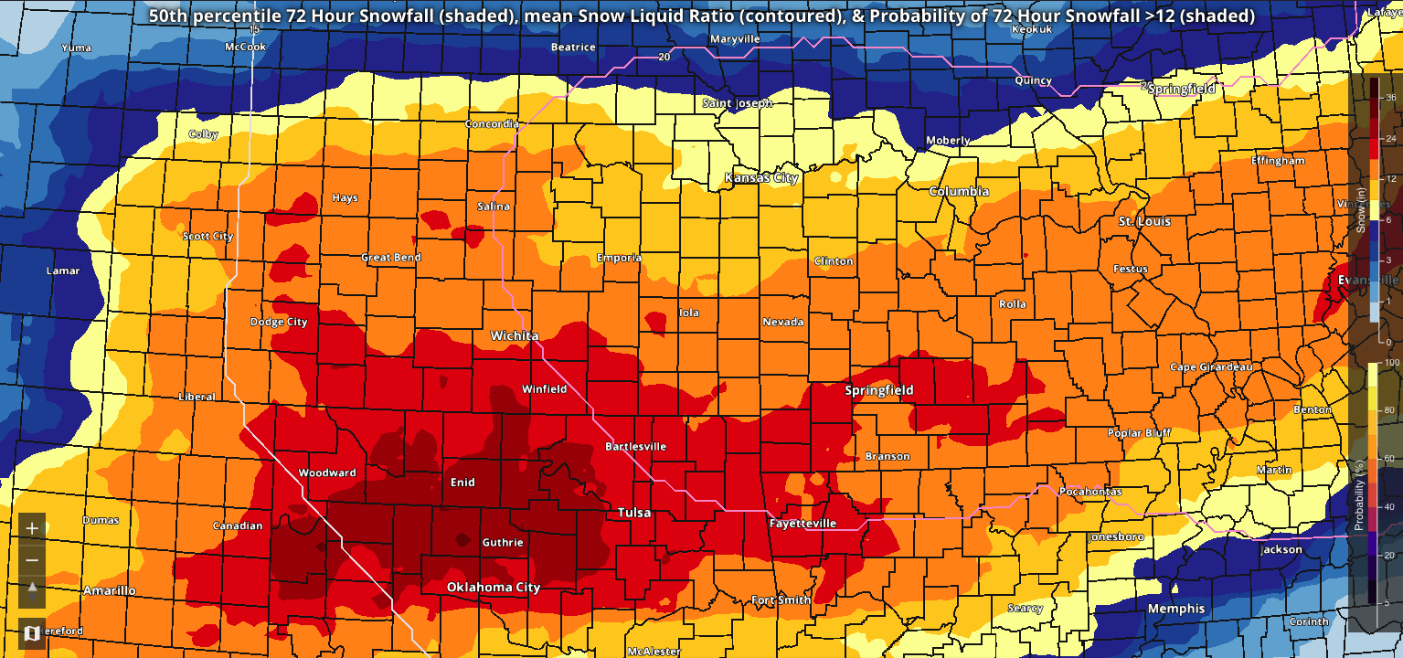 This is the 01z 72-hour 50th percentile snowfall off the National Blend of Models. This is a significant bump up from the 19z run. The red area is 24-30 inches NW of OKC, the reddish orange area is snow totals of 18-24 inches, orange is 12-18. Goodness. -