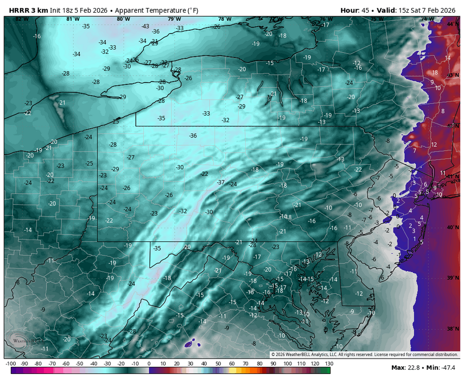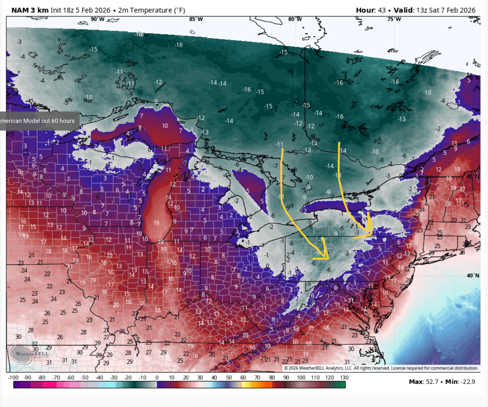 Geesh, I guess not. I’m probably in the minority here but I’m not really all that impressed with the wind threat if we’re talking strictly from a mph standpoint. Most guidance and that includes the high res stuff like the HRRR that normally ramps up surface winds barely support advisory winds much less anything of the variety that would cause widespread power outages. But I could get on board with a wind advisory for 45-50mph I suppose. Basically a typical wind event in other words, it gusts to 60mph at @canderson’s house in those anyways haha. This event also has a more northerly trajectory to the wind as well being more NW or even NNW.. less of a direct downslope component to enhance wind gusts IMO. What I am impressed with is the COMBO of the winds and cold temperatures. Dynamically this will be the coldest shot of the winter to date. The more northerly component to the wind minimizes modification of the airmass source travelling over the Lakes, which already have a good bit of ice with Erie >95% covered. Non-diurnal “High” temps for Saturday will occur before about 3-4am Sat morning. Sat daytime temps will struggle to get out of the single digits in most of the area. Laurels and some north-central might not crack zero. You can see how there’s an appendage of non-modified Arctic air that reaches PA. I drew the rough surface wind direction. It mostly goes over the frozen portion of Huron and Erie. Saturday morning will probably be the worst for wind chills, though it won’t be good all day. I think most of that extreme cold watch has a good chance of being upgraded to the full blown warning. Here’s the kind of wind chills the 18z HRRR put out after daybreak Saturday morning. I haven’t really seen those kind of wind chills since the Christmas 2022 cold shot. -