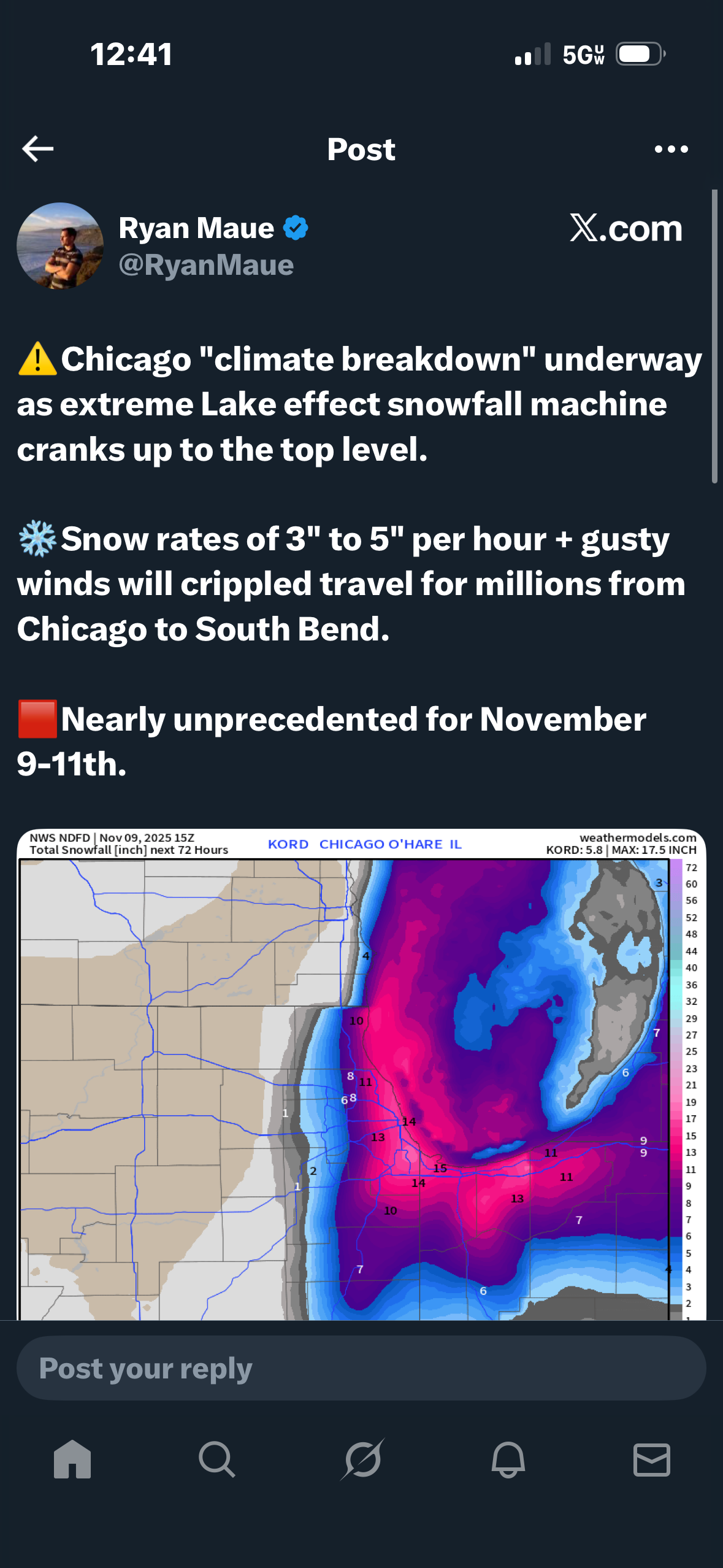 The official Chicago records have been at O’Hare since 1980 and were at Midway Airport 1942-79. Prior to that they were even closer to the lake. Keeping this in mind: the official Chicago record heaviest Nov snowfall for a single storm is 12.0” (11/25-6 of 1895). That was from a strong low (rather than pure Lake Effect) that moved from N Miss to E of MI per old wx maps. Like @donsutherland1said, it’s highly unlikely this will even be close to 12” officially. (I saw that he predicted ~4”.)THE FOLLOWING IS THE UPDATED LIST OF THE LARGEST SNOW EVENTSDURING THE MONTH OF NOVEMBER FOR CHICAGO DURING THE PERIOD OFRECORD...WHICH IS SINCE 1884:RANK DATES EVENT SNOWFALL /IN/-----------------------------------------1. NOV 25-26 1895 12.02. NOV 20-21 2015 11.23. NOV 6-7 1951 9.34. NOV 26-27 1975 8.6 5. NOV 27-28 1891 6.0RANK MONTH MONTHLY SNOWFALL /IN/-----------------------------------------1. NOV 1940 14.82. NOV 1895 14.53. NOV 1951 14.34. NOV 2015* 11.25. NOV 1975 10.8