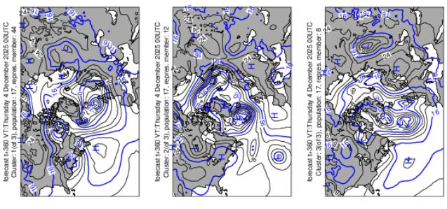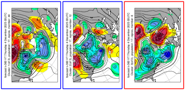 The idea of an imminent SSW/MSW event is a high-confidence one. However, there is often a tendency to treat forecast developments (“SSW → PV split → EPO-/WPO-/AO-/PNA- → brutal NE weather”) as if it were an inevitable, linear, cause-and-effect chain. If such logic were reliable, forecasting accuracy at multi-week stages would be high. That isn't the case. I personally believe that there will be an increase in wintry effects, especially from near mid-December into at least late December based on typical 1-3 week lags and the currently forecast teleconnection evolution. That's my baseline thinking at present. However, that thinking isn't cast in stone. Reality is messier. For example, not every SSW leads to a prolonged deep AO-. Not every AO- period results in severe cold and/or excessive snowfall. From this far out, model skill is poor to non-existent on critical synoptic factors e.g., future storm tracks, the emergence of North Pacific jet streaks, exact ridge-trough placement, etc. A bad pattern coupled with a well-timed phase can produce a big snowstorm; a great pattern but badly-timed phases or absence of shortwaves can result in a lack of snowfall. Seemingly favorable ensemble means can also disguise large differences among ensemble members. Clusters can provide insight into some scenarios. Here are the forecast 500 mb anomalies at 360 hours: Here are the latest 500 mb and 1000 mb ECMWF clusters: 500 mb: 1000 mb: For now, potential is on the table. But nothing is locked in, just yet, in terms of specific details. -