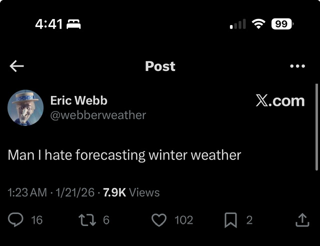 latest discussion from WPC: Probabilistic Heavy Snow and Icing Discussion NWS Weather Prediction Center College Park MD 405 PM EST Wed Jan 21 2026 Valid 00Z Thu Jan 22 2026 - 00Z Sun Jan 25 2026 ***Major Winter Storm To Bring Significant Impacts To The South Friday Through This Weekend, Expanding Up The East Coast Saturday Night Into Sunday*** ...Southern Rockies, Southern Plains, Gulf Coast, Mid-South, Southern & Central Appalachians, & Mid-Atlantic... Days 2-3... The ingredients for the impending major winter storm begin to take shape Thursday night. A broad upper trough located off Baja California will work in tandem with a ridge axis near Mexico to direct a rich plume of tropical East Pacific moisture into the Southern Rockies and Plains. At the same time, an arctic front ushers in the coldest temperatures this season across the Great Plains with a highly anomalous dome of arctic high pressure building in over the North Central U.S.. As high pressure rushes south, easterly upslope flow induced between the high pressure to the north and lower pressure near California will cause upslope flow into the higher terrain of the CO and NM Rockies with lighter snowfall in the central High Plains. WPC probabilities show high chances (>70%) for snowfall above 9,000ft in the CO/NM Rockies through Saturday afternoon. Precipitation will blossom over much of KS, OK, and TX Friday, starting as rain across much of TX initially, but look for precipitation to transition to snow over KS, northern OK, and the TX Panhandle by Friday afternoon and evening. Farther south, strengthening low- level WAA will over-run the incoming sub-freezing layer in the lowest 2,000ft of the atmosphere from West Texas to as far east as the Mid-South. Sleet will become more prevalent over the Red River Valley, north-central AR, and into western TN, while freezing rain is the primary preip type from the TX Hill Country through the ArkLaTex and as far east as the TN Valley. Heavy sleet is possible in some of these areas with multiple inches of sleet possible through Saturday. The slow progression of the upper trough over Baja California and the bitterly cold arctic air-mass anchored over the eastern two-thirds of the CONUS is a recipe ripe for prolonged freezing rain from central TX to as far east as the southern Appalachians through 00Z Sunday. WPC probabilities show concerningly high probabilities (50-70%) for ice accumulations through 00Z Sunday over one-quarter inch. The areas of greatest concern are over the ArkLaTx, southern AR, northern LA, northern MS/AL, and southern TN where low-to-moderate chances (30-50%) exist for over one-half inch of ice. While this discussion is geared to the short term (ending 00Z Sunday) the ice in all these areas are forecast to continue through Saturday night and even into Sunday. There is great concern for extensive tree damage and power outages from central TX on east through the Mid-South and into the Southern Appalachians into Sunday. Farther north, the air-mass through the depth of the atmospheric column remains cold enough to support all snow from the Central Plains on east through the Ozarks and across northern TN and much of KY beginning Friday evening in the Plains, then into the TN/OH Valleys Saturday morning. By midday and into Saturday afternoon, periods of snow will reach the southern and central Appalachians and potentially the VA/NC Piedmont. Snowfall rates topping 1"/hr are likely in areas just north of the strongest 850-700mb FGEN zone and vertical velocities are highest in a highly saturated dendritic growth zone in the Central Plains and OH Valley. The very cold temperatures over KS on east through MS and into the OH Valley will cause SLRs to range anywhere from between 12-18:1 with the higher SLRs over KS. WPC probabilities through 00Z Sunday depict high chances (>70%) for >4" of snow over central and southern KS, much of northern OK, the TX Panhandle, and into the Ozarks of northern AR and southern MO. The best chances for >8" of snowfall reside over the Ozarks where moderate chance probabilities (40-60%) are present. Similar to the ice, the snow will by no means be over given the extensive plume of anomalous moisture emanating out of the East Pacific. By Saturday night, southerly flow out of the Gulf will continue to direct copious amounts of moisture into the eastern U.S., resulting in a highly disruptive and dangerous winter storm from the Mid-South to the Mid-Atlantic. WPC continues to issue Key Messages for this winter storm and a link to them can be found below.