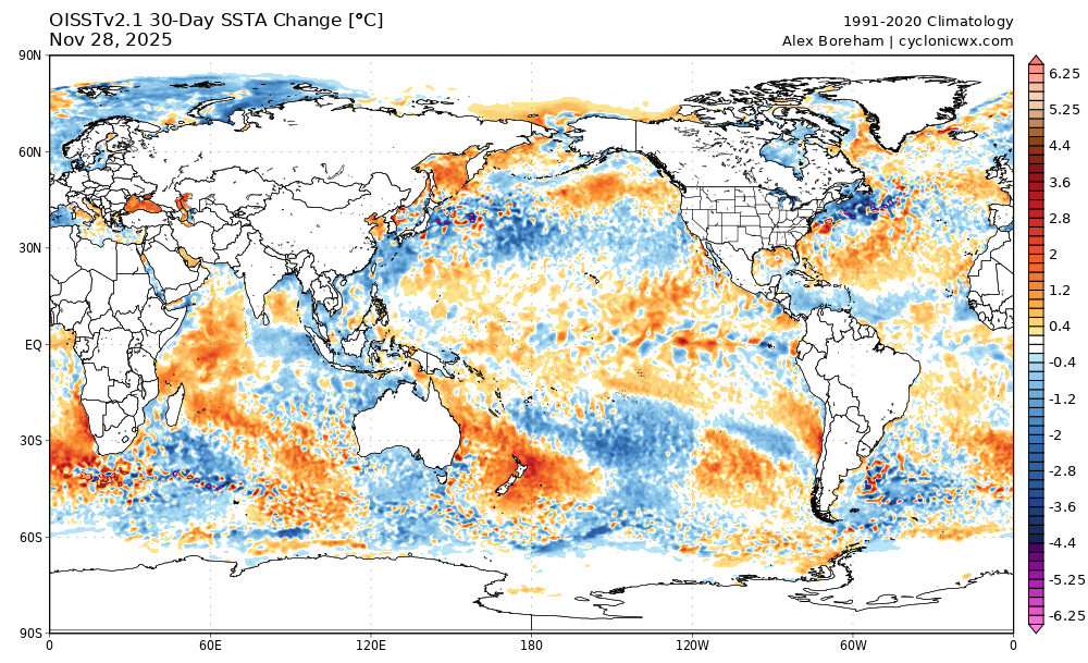 SST changes are pushing the warm pool east. This may help to favor MJO waves pushing into our more favorable phases through the winter, at least to some degree.