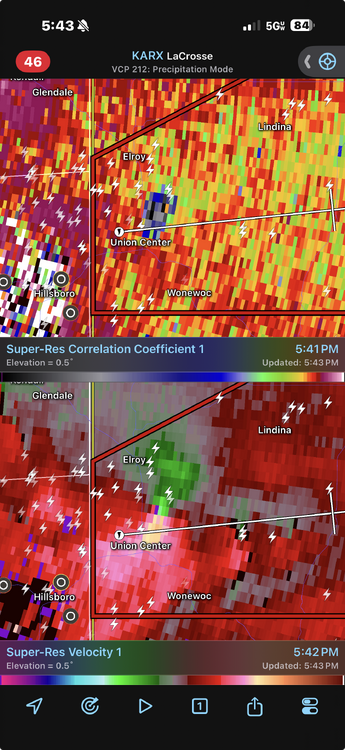 Madison cell is now wrapping up too. Expect a tor warning soon. Mean looking hail filled RFD. Looks damaging. Edit: Now a cc drop and tornado warning. Could be damaging RFD winds also lofting debris.