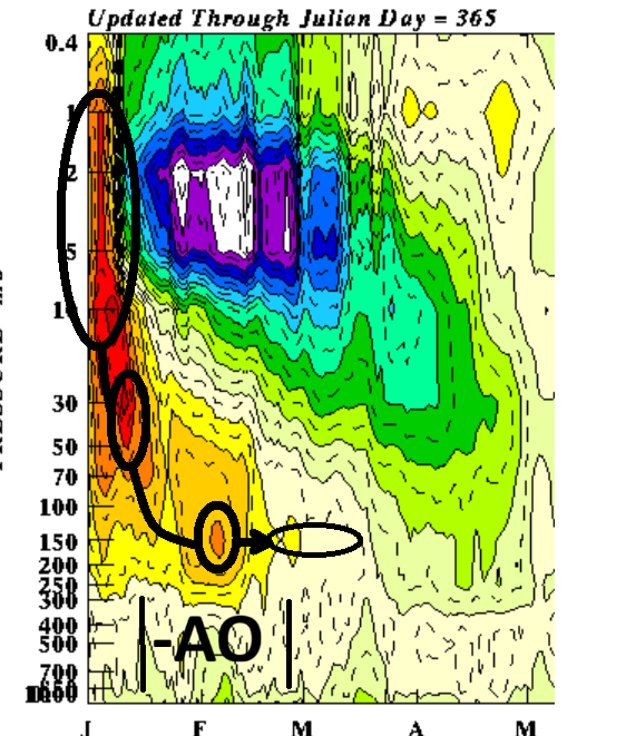 That's about right.... it takes about 20 days ( three weeks)... I've shown this before but here. This example was 2004. Text back high altitude intrusion event, then nodal mass down welling with 3 or so week lag prior to AO forcing/'blocking' This example actually first became evident over Xmas week prior to Jan 1 ... and the AO crashed by the 20th. -