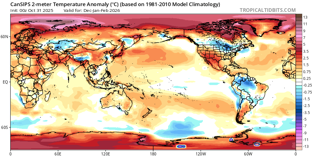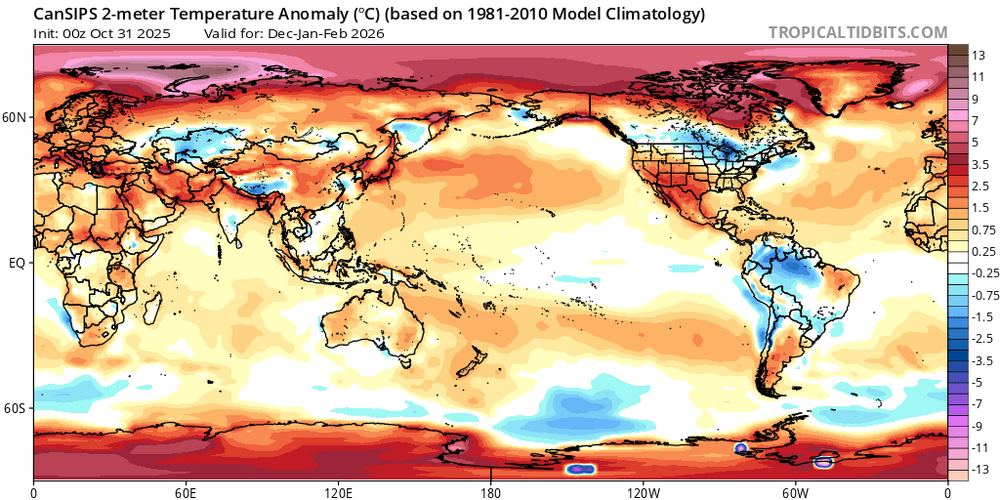 The new CANSIPS for DJF is the 9th in a row with the coldest winter anomalies (vs colder 1981-2010 than 1991-2020) in the N Hem centered over the W. Great Lakes: Any thoughts?