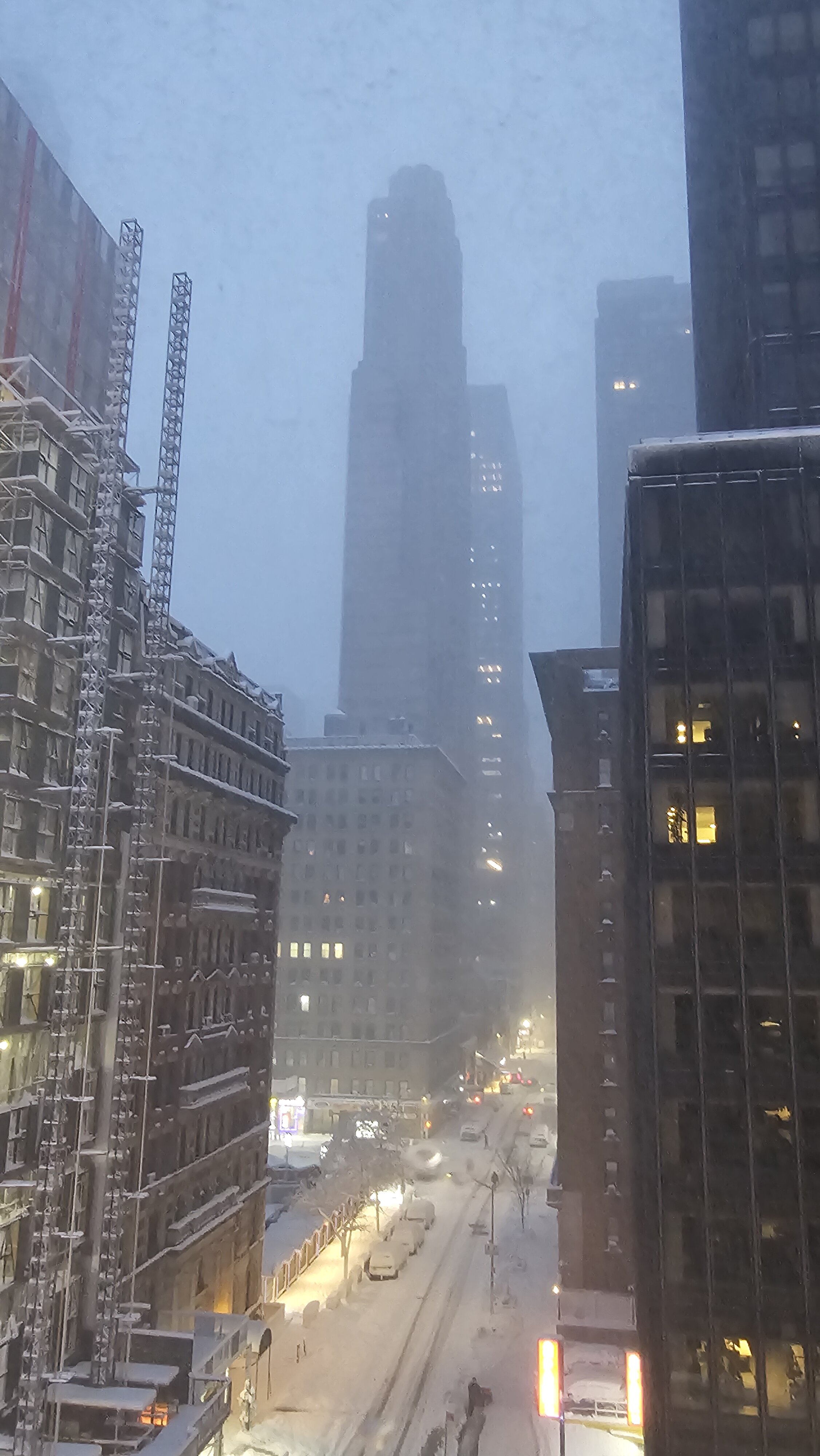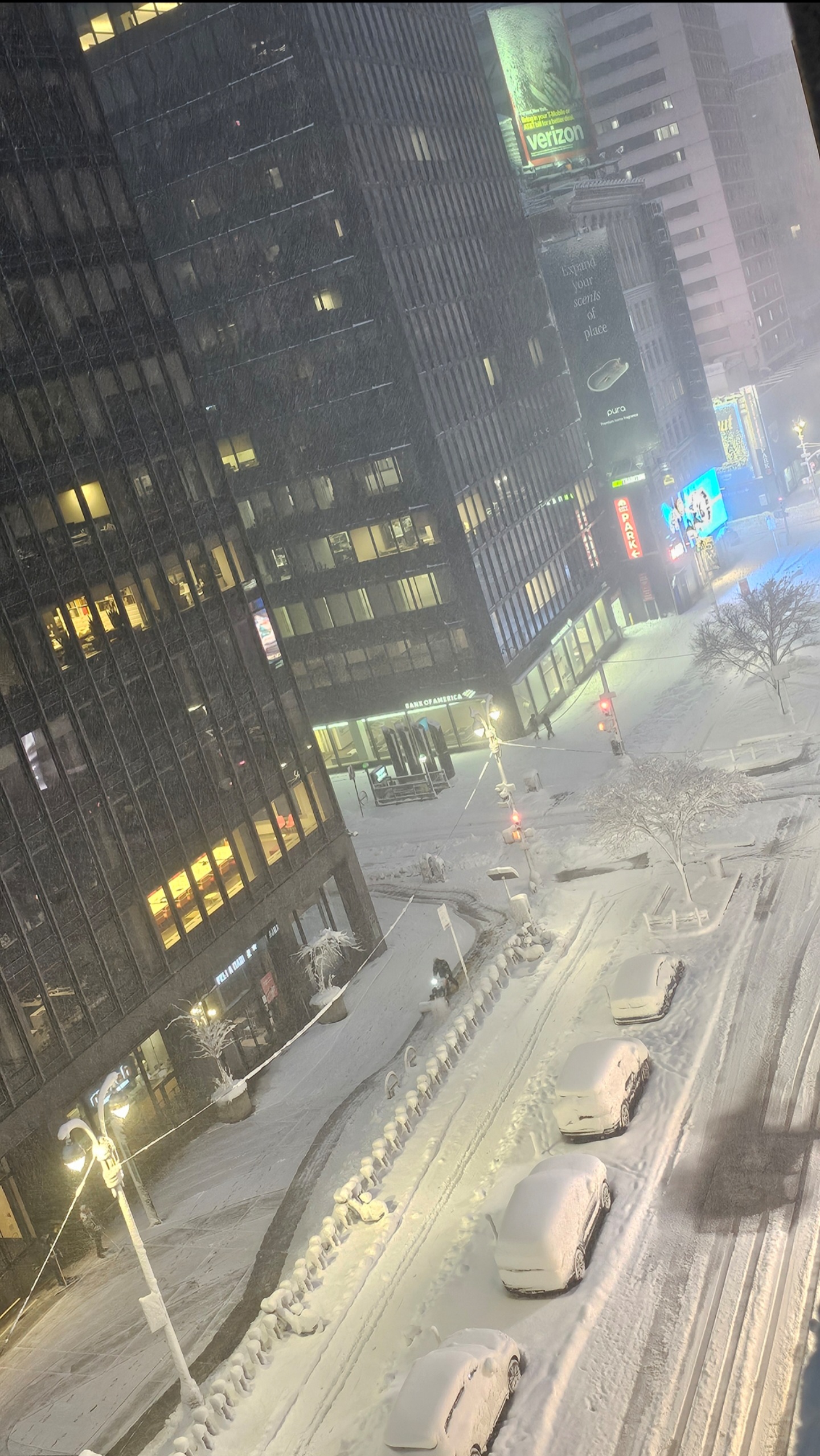 Just woke up to take a leak and peak outside. Hard to tell from the 7th floor how many inches but Manhattan is pretty well covered. I'll prob go for a walk at 0900 or so