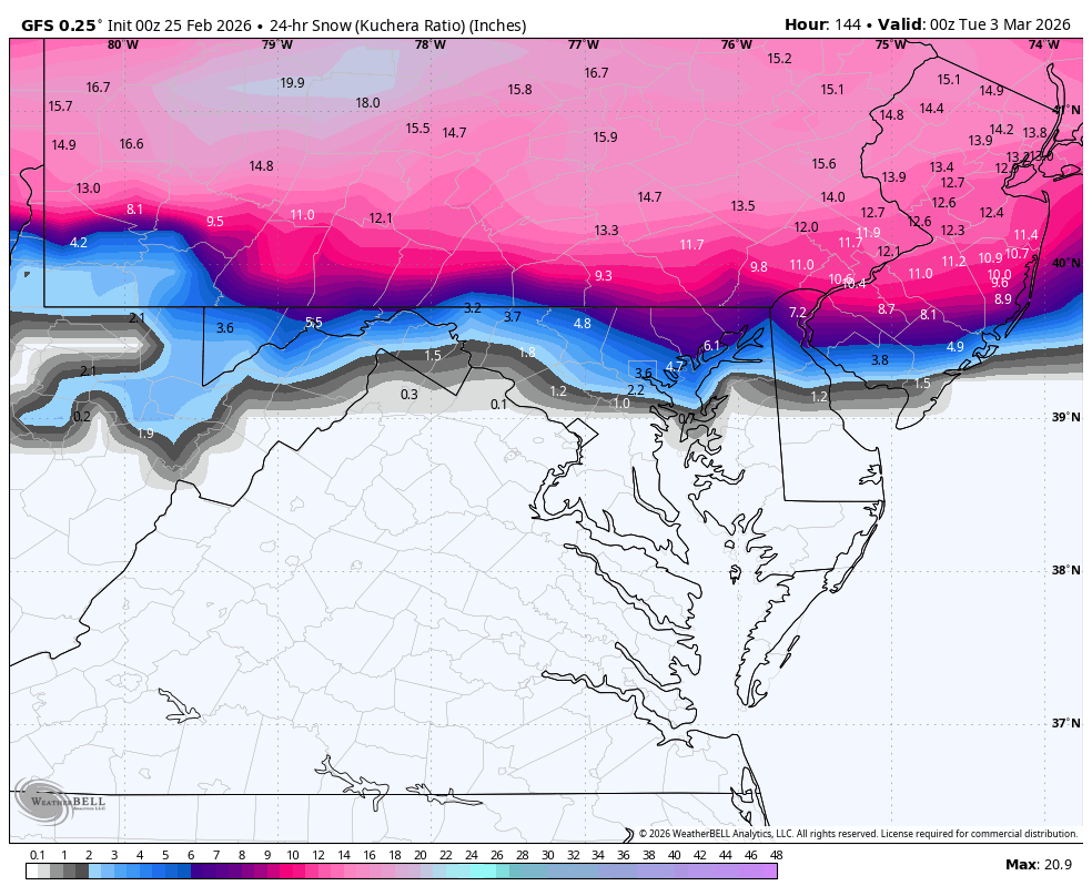 Central and northern PA at 2'+. Wonder if the Gfs is treating them like it treated us with its early runs for this past weekend. Love to see that come 100 miles south. -