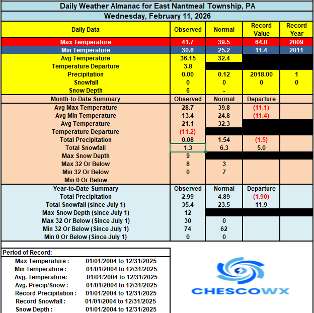 Today is our 27th straight day with snow cover here in Chester County. Tomorrow we will move to the 15th longest such stretch and 24th overall snow cover streak in county history with 133 years of records back to 1893. Below normal temperatures will continue through tomorrow before we warm to near normal temperatures over the weekend. There is a chance of some snow or rain arriving later Sunday with the highest chances across more southern areas. We look to continue to warm next week with temperatures well into the 40's by Tuesday. We will likely turn colder again by the end of new week. -