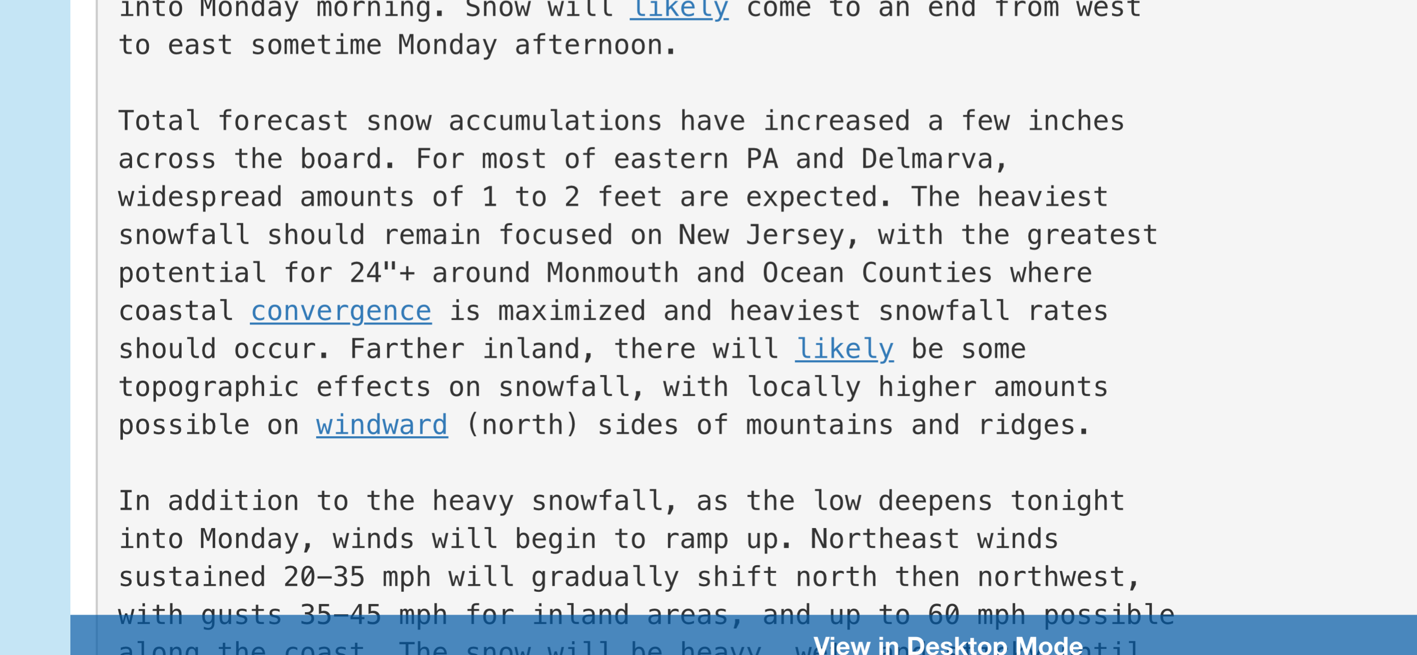Highly dependent on location. If you're on the downwind shore of a large frozen lake, you might get buried in a drift...or not depending on what is upwind of the lake. There will be several foot deep drifts in spots on top of the Kings Park bluffs, but that's relatively common. A slight tweak is that the winds might be more northerly than northeast.