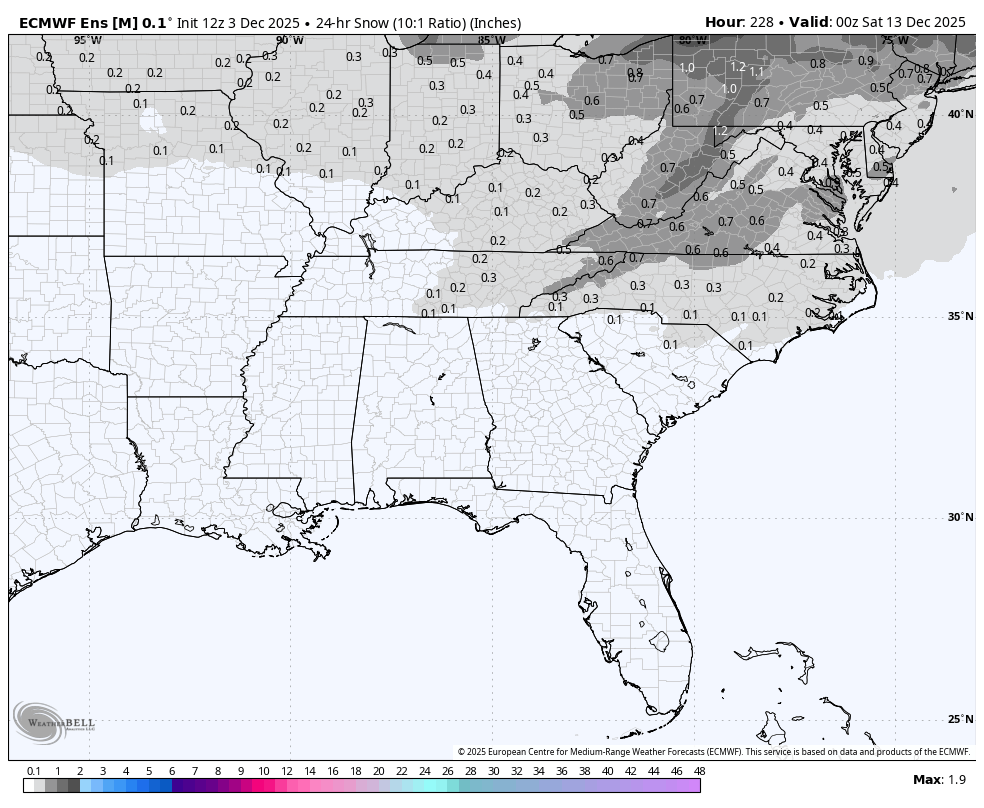 The 12Z EPS is hinting at a 3rd NC snow threat on 12/12 with measurable snow from 7 of the 50 members, mainly from lows that move just offshore: