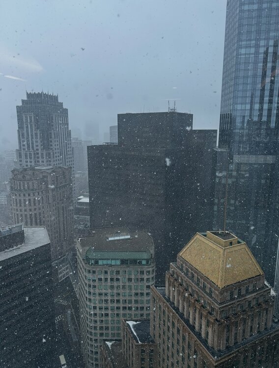 6. Snow globe shaken in Boston. Big fluffy flakes floating upwards by the office window