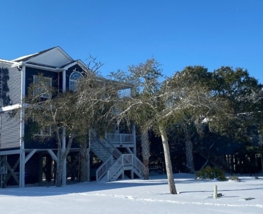 Kinda surprising, but kinda not given the depth of the cold air atw to the coast in SE NC....Crystal Coast and Brunswick County are the only S facing Atlantic coastline south of Long Island.....precip flow was off the ocean last night. At OKI we get our worst thunderstorms off Onslow Bay to the south, and even a high end tropical storm or CAT 1 with a landfall around NMB/Little River can give us an 8-10' storm surge (Isiais and Matthew most recently) because of the right (perpendicular to flow) angle, shallow water at the mouth of the Cape Fear and enhanced rainfall. I have seen what resembles an 8' tidal bore with a strong north wind and a big runoff from recent heavy rains on the river when the tide changes during the winter (river water is ass-.nasty, btw)... I always wondered how it would play out during a winter storm with the right amount of cold air....guess I finally have my answer My neighbor at Oak Island sent me a pic of my house from this morning....he said around 8"+