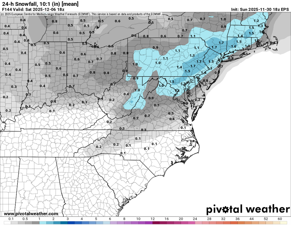 24hr snowfall ending 144hrs on the Eps looked like this, keeping in mind how stingy the Eps can be on individual threats.