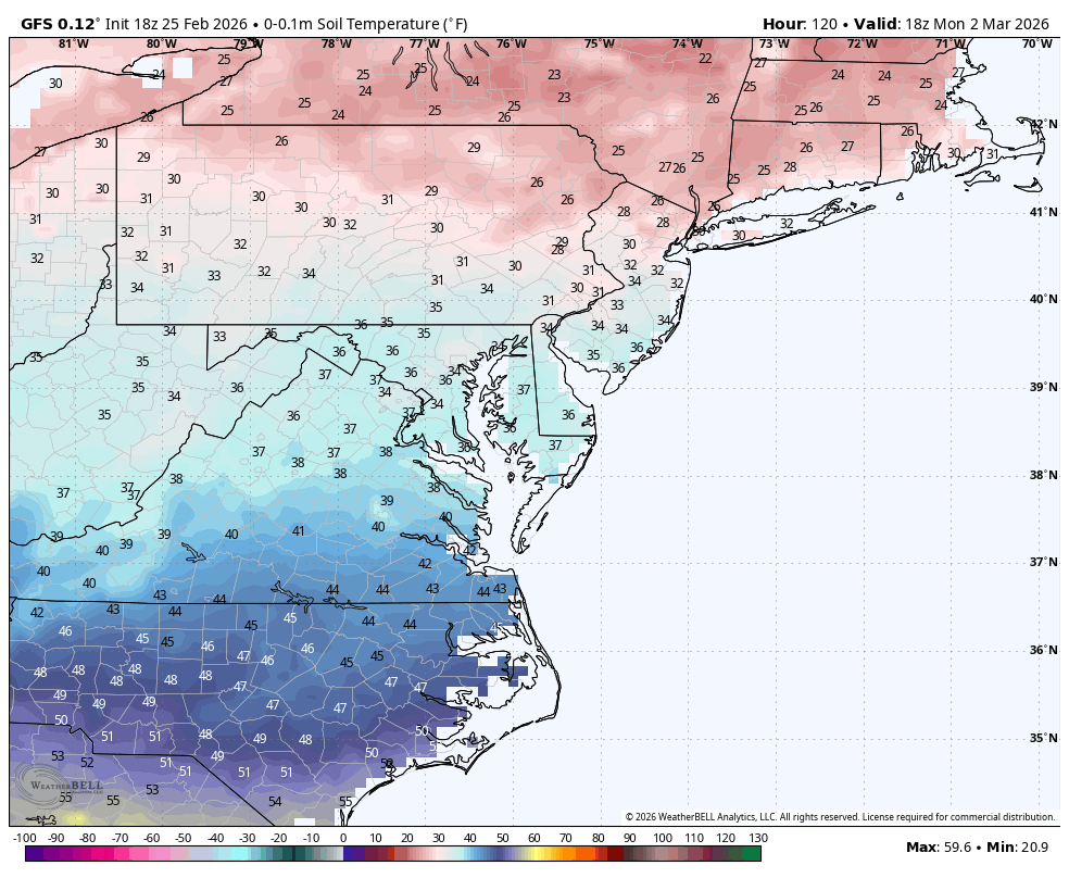 The big storm for me last weekend was a lot of white rain. Like it or not, ground temps and sun angle matter this time of year. If the snow is a light snow during the day on Monday even with temps below freezing it will melt. Soil temps never fall below freezing on Monday. Have to factor that in. -