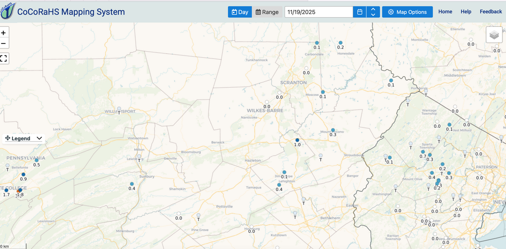 Processes: Cannot circumvent checklists... pilots don't and they fly us successfully. I got a little lazy...circumvented processes. Saw the trend in HRRR/RAP/RRFSA prior to 14z/18 yesterday, accepted HRRR resulting in an F forecast. Global CMCE an EPS ensembles (GEFS, SREF and SPC HREF snowfall terrible) had the axis right which was near I80 but amounts below 2" on 10-1. That should have cautioned me on the 12z/18 verbatim HRRR post. ANDDDD when we're on the gradient edge of qpf, caution flag. I've grown confident in the ECAI but it failed miserably on the north fringe this morning and the EC OP through 00z/19 was lacking. 12z and 18Z/18 HRRR were very similar then I saw the 00z/19 HRRR drop back down to I80--wasnt sure it would hold there. It did. Bottom line: Follow processes ALWAYS inclusive of merging ensembles and being careful on the gradient edge. I sure hope to remember this lesson. Wantage Trace flurries and qpf... basically nil. Attached CoCoRaHs snowfall.