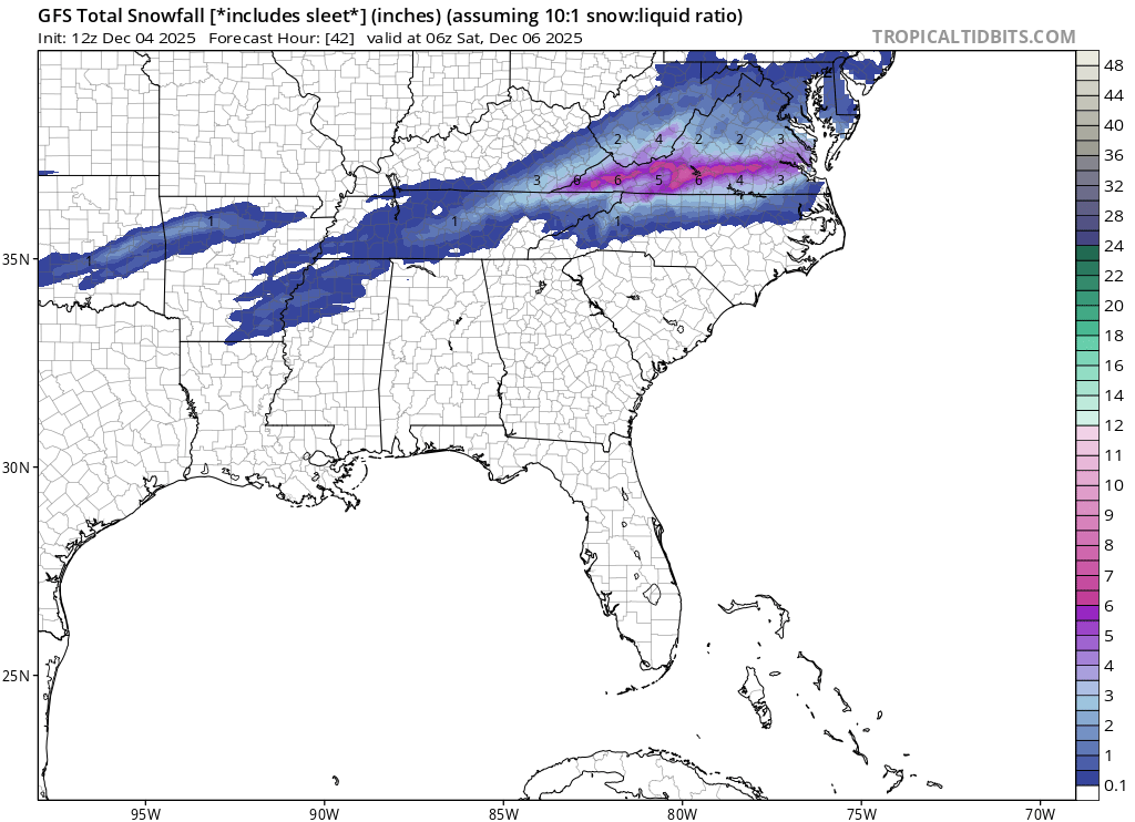 00z GFS Model – Total Snowfall (10:1 SLR) for Southeast U.S. | Tropical Tidbits