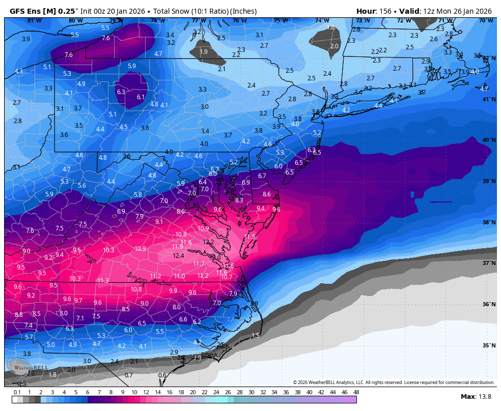 This map from Pivotal must include sleet and ice unlike the WxBell maps. It's significantly higher, and probably more realistic given the likelihood of significant sleet accums on the southern end of the snow band.