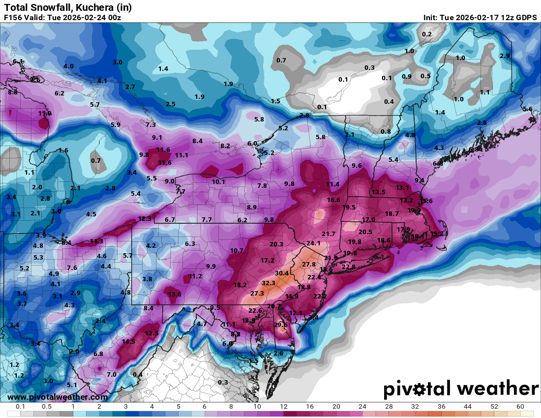 Would drop 8 in DC, 18 in Baltimore, over 2 feet for some at the M/D and up in PA. Kuchera. Similar 10:1. Most of VA gets skunked unfortunately.