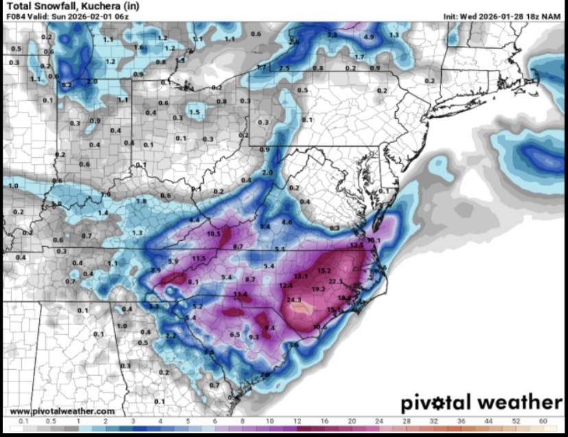 I suspect it's going to be a big eastern half of North Carolina/South Carolina snow event. That area is the general focus for Bouncycorn.