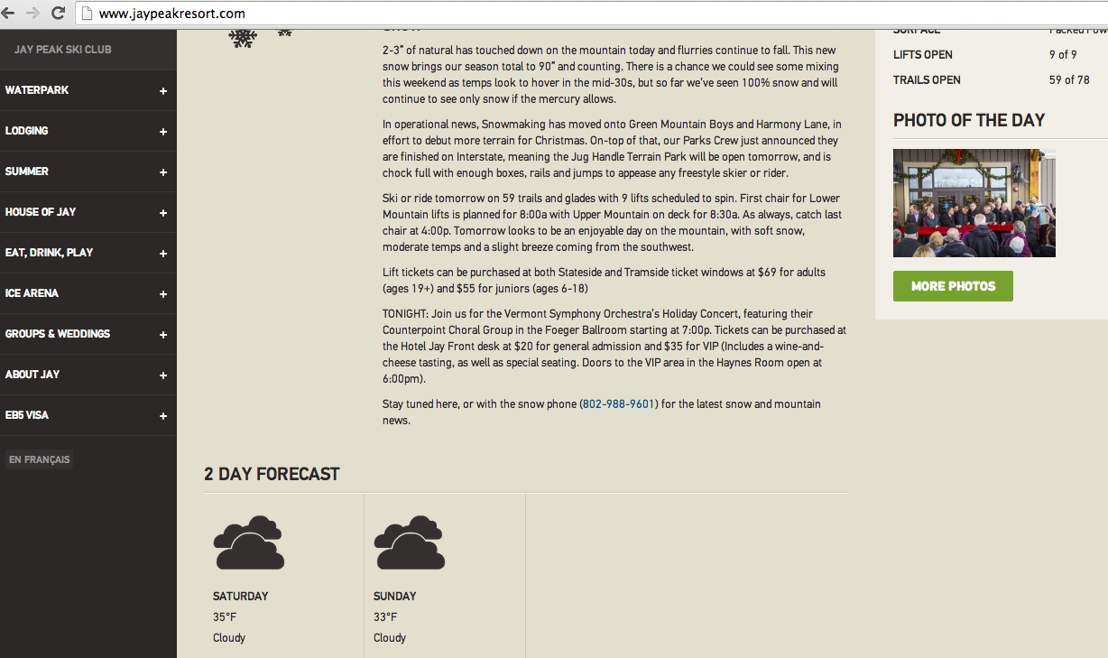 Jay Peak Resort December 20th, 2013 snow report and forecast.