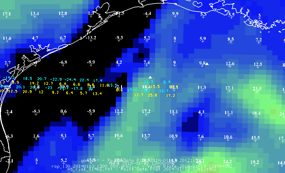 A RAP model-derived microburst windspeed potential index (MWPI) product, with GOES-derived MWPI values overlying the image, over the Gulf of Mexico on 13 January 2014.