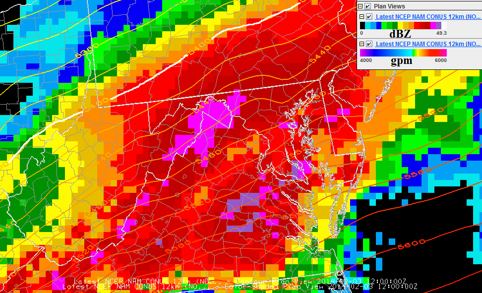 NAM Radar/1000-500mb Thickness overlay valid 02/03/14 at 1200 UTC (0700 EST)