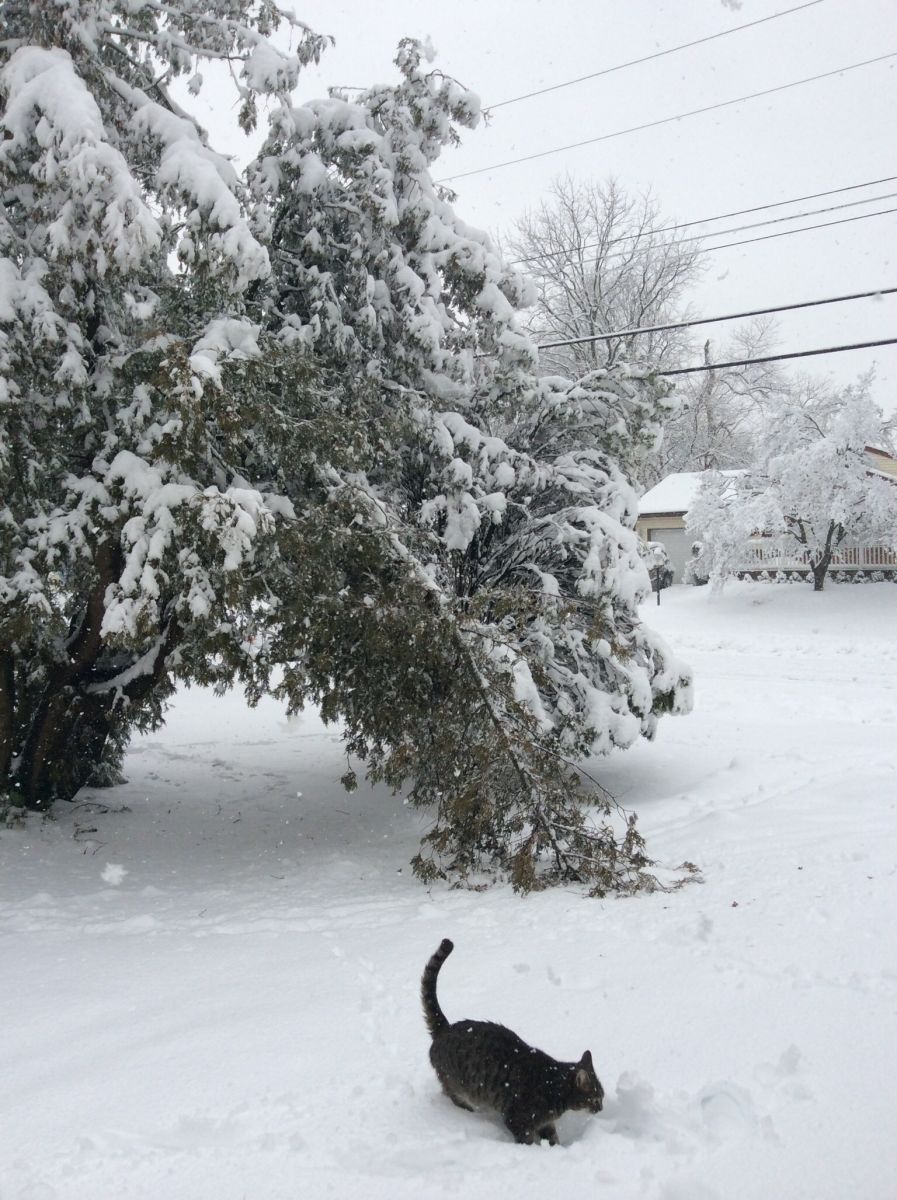 Tree branch falls victim to the heavy wet snow. 7.5" fell, cat loved it.