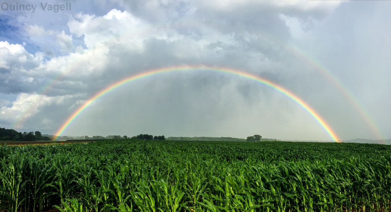 A vibrant double rainbow appears to hover over a field of corn in northern Missouri. June 28th, 2015.